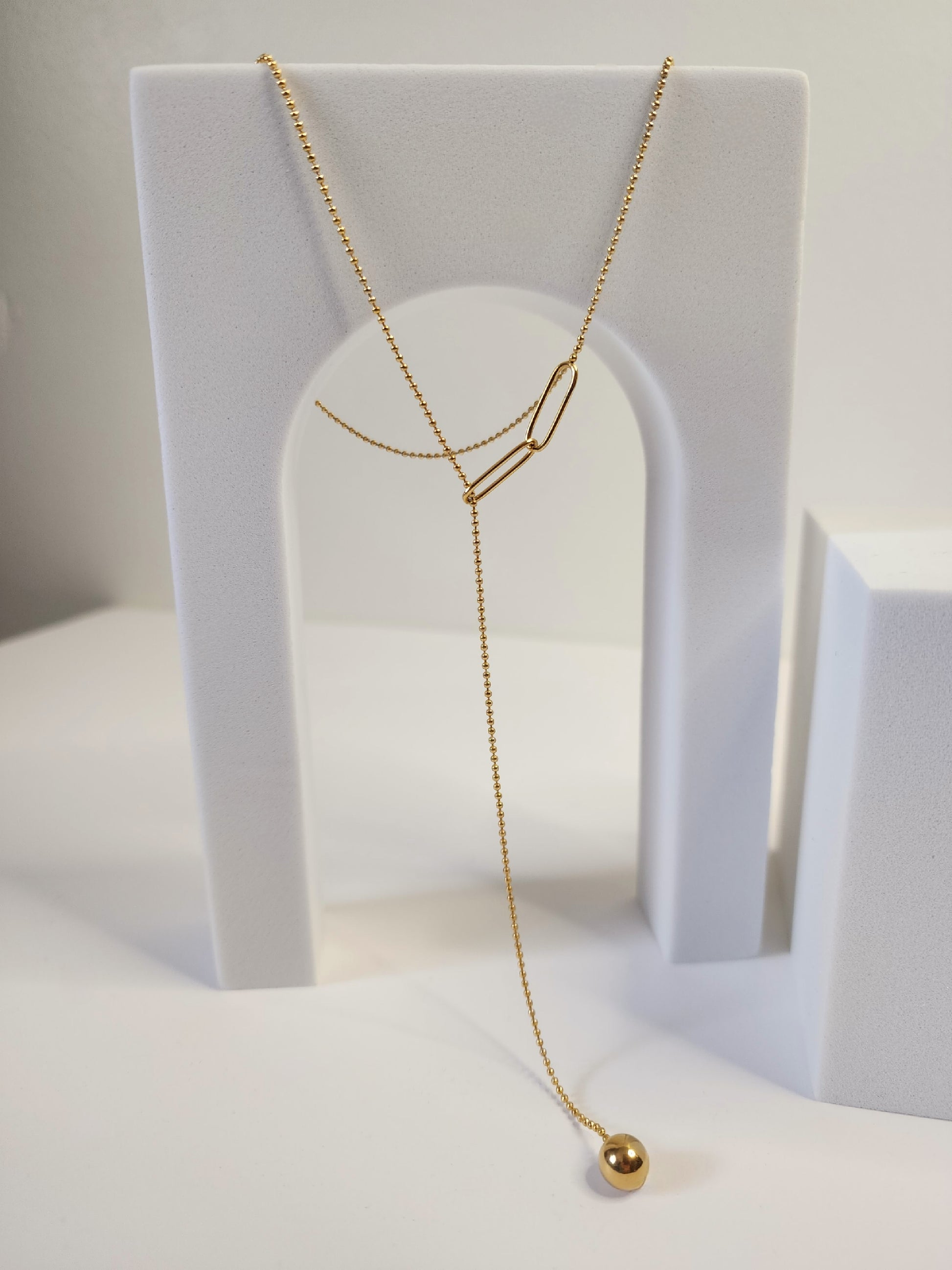 This elegant lariat necklace features a durable 18k gold plated stainless steel construction, ensuring both style and longevity. Its water resistant capabilities make it easy to wear in any setting, perfect for adding a touch of sophistication to any outfit.